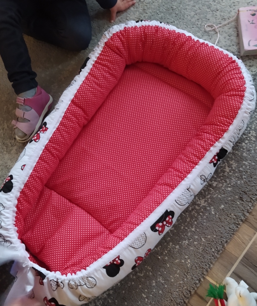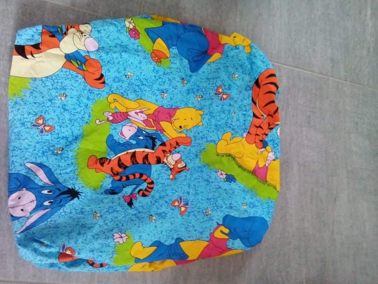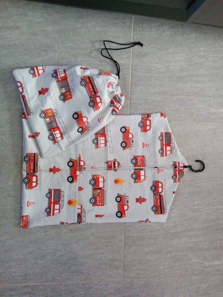 100 % pamut, 30 fokon mosható. Vékony vatelinnel bélelt -óvis méret.